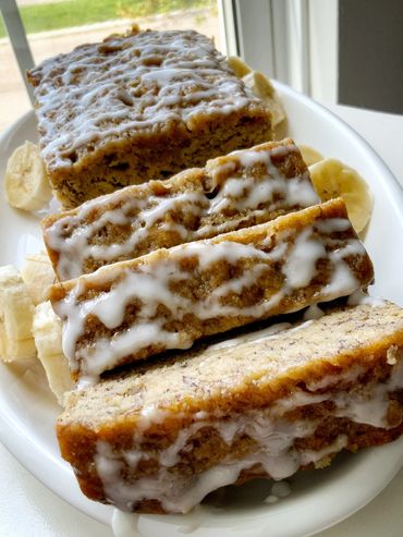 A moist, tasty loaf of sweet, homemade banana bread. Topped with a rich vanilla icing!